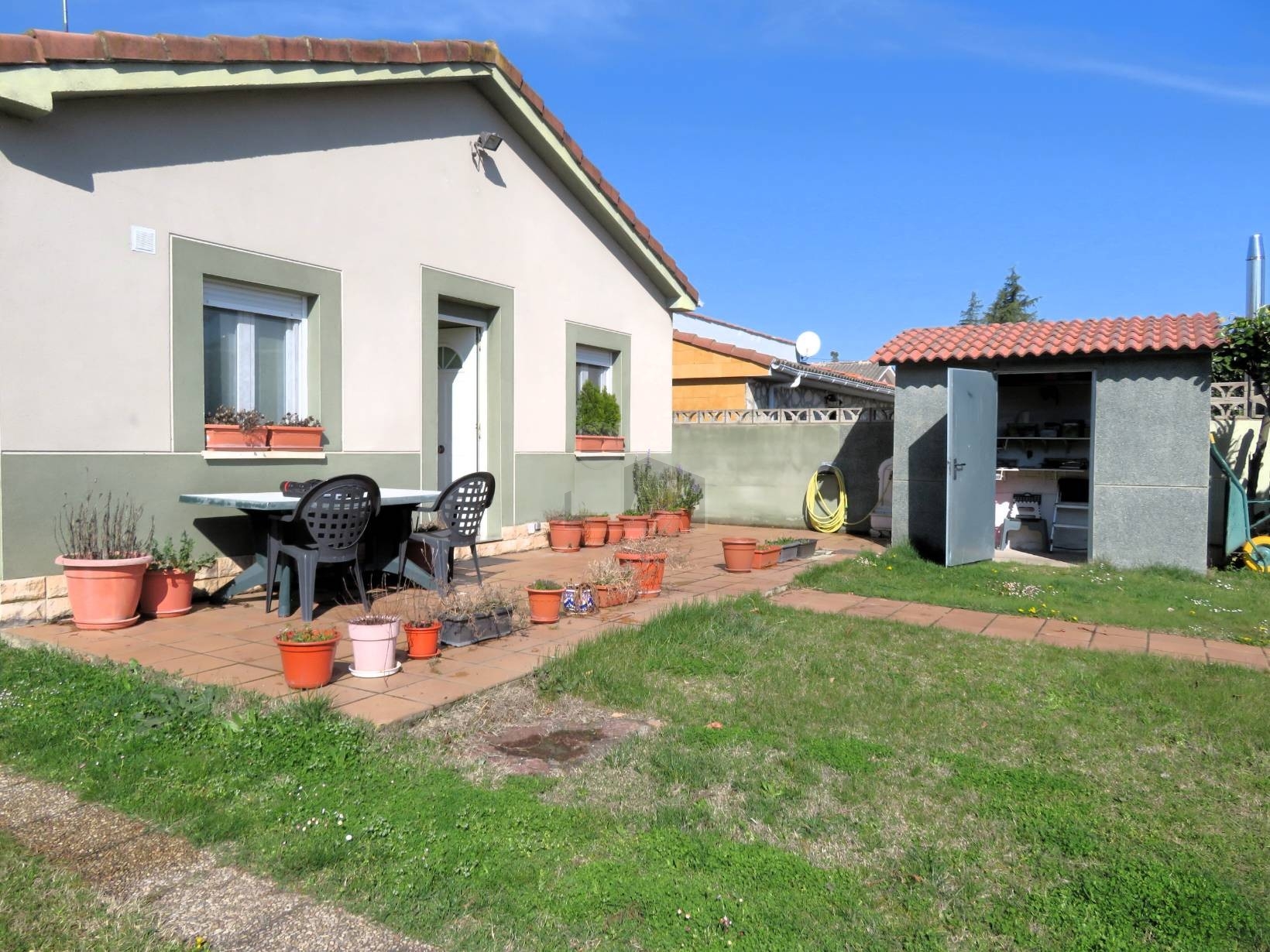 El resto del terreno, de 334 m², está destinado a zonas ajardinadas que aportan un ambiente relajante, además de incluir un pequeño cobertizo utilizado como trastero, ideal para almacenamiento adicional.