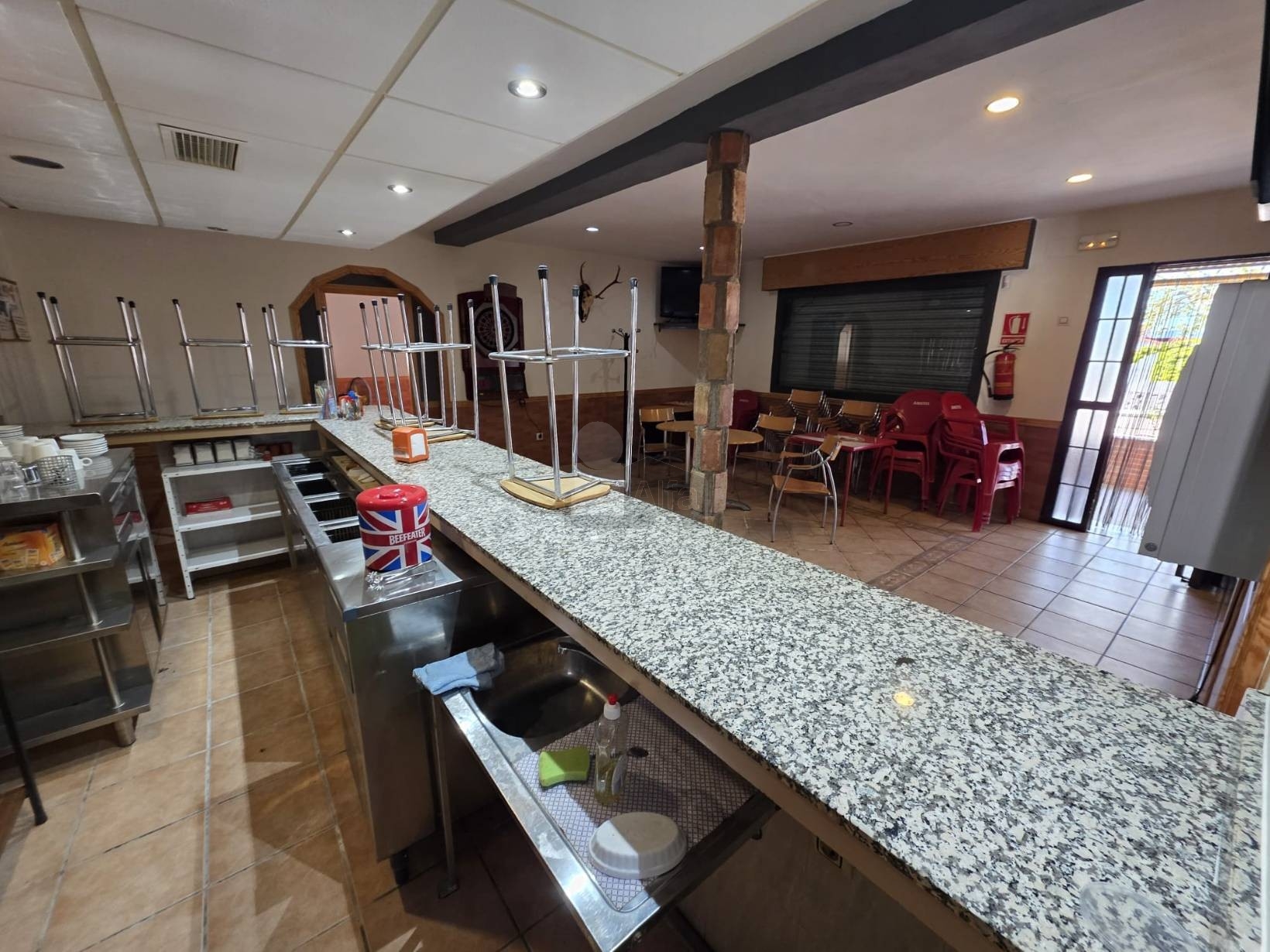 El inmueble cuenta con una distribución muy funcional: dispone de una amplia zona de barra, cocina equipada, despensa y una zona independiente perfecta como espacio de ocio o recreativo. Además, incluye un baño con acceso independiente mediante dos puertas, ofreciendo mayor comodidad.